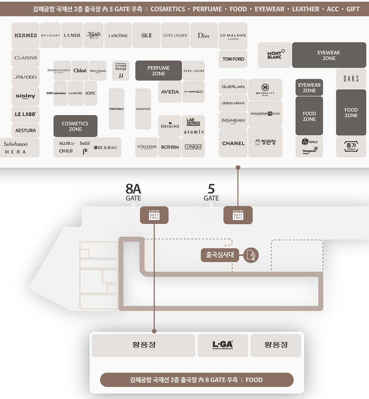 乐天免税店金海机场店位于金海机场出境大厅 2 层,是金海机场唯一的免税购物区。这里入驻有 CHANEL、G.ARMANI、JO MALONE、BURBERRY、正官庄等百余个品牌,可供顾客尽情享受免税购物的乐趣。