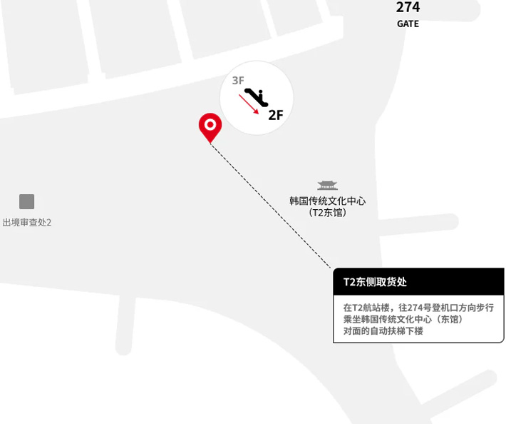 上图为乐天免税店仁川机场 T2 航站楼东侧取货处,往 274 号登机口方向步行,乘坐韩国传统文化中心 (东馆) 对面的自动扶梯下楼 (2 层)。