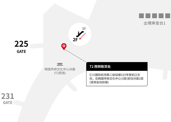 上图为乐天免税店仁川机场 T2 航站楼西侧取货处,225 号登机口方向,在韩国传统文化中心 (3 层) 前往对面 2 层 (使用自动扶梯)。