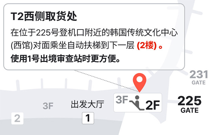 上图为新世界免税店仁川机场 T2 航站楼西侧取货处,行至 225 号登机口附近的韩国传统文化中心 (西馆) 对面,乘坐自动扶梯到下一层 (2 楼)。